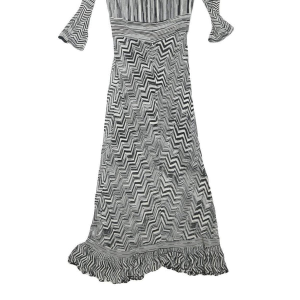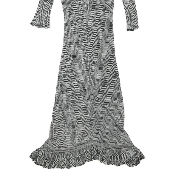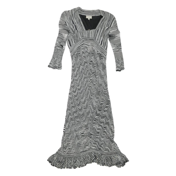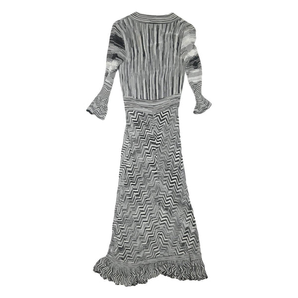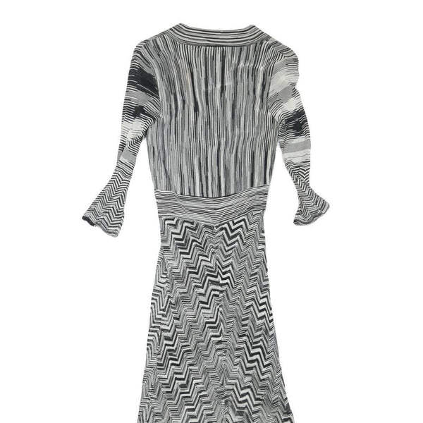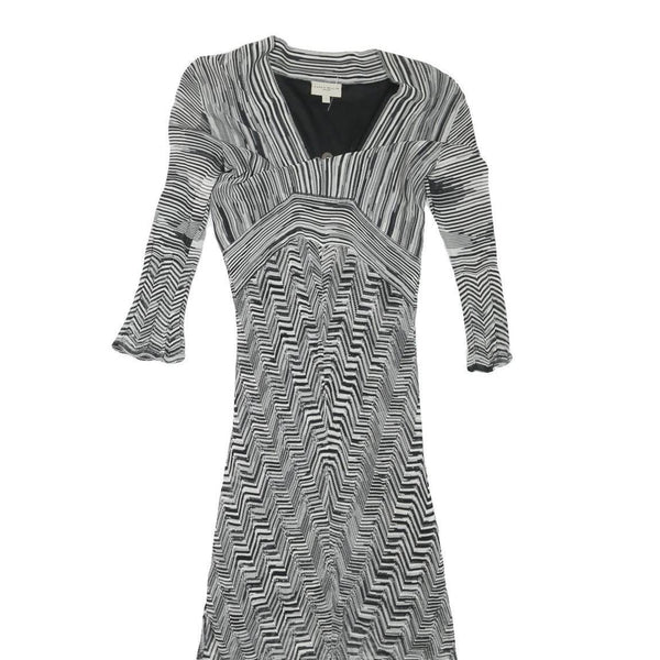 This Karen Millen dress features a striking black and white striped pattern arranged in dynamic chevron and linear designs that create an eye-catching visual effect. The dress includes a fitted bodice with a collar neckline and three-quarter sleeves with subtle ruffle details at the cuffs, enhancing its feminine silhouette.