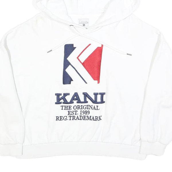 This KARL KANI womens pullover hoodie features a primarily white cotton blend fabric with a large embroidered logo patch on the front in red and navy blue. Beneath the graphic, the brand name and trademark details are also embroidered in navy, giving it a bold and classic streetwear look. The hoodie has a drawstring hood and elasticated cuffs and hem for a secure, comfortable fit.