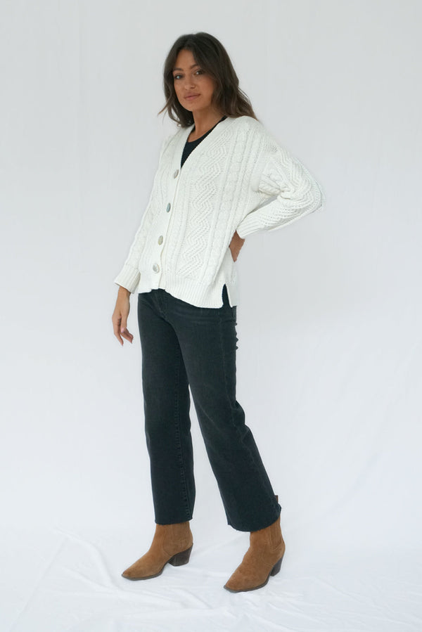 The Kennedy Cardigan is the timeless, sustainable sweater of your dreams. With her classic cable knit pattern, soft hand feel, luxurious real shell buttons, and the perfect relaxed fit, she is a closet staple you will wear forever. The Kennedy is ethically hand-knitted by our incredible artisans in Bali which support preserving heritage techniques. Style her with the Stella Midi Dress for the complete look.