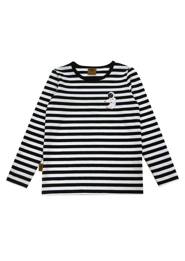 Get ready for adventure with this trendy long-sleeve top that will make your child feel like an astronaut! Designed with striking black and white stripes and charming astronaut print, it combines style and practicality. Made from Oeko-Tex 100 certified materials, this kids' top is produced by Hebe in Latvia, meeting European Union manufacturing standards for quality and safety.
