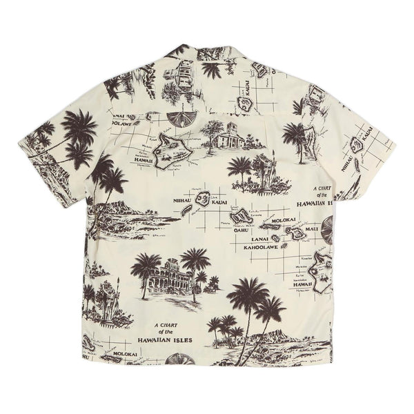 This King Kalakua men's shirt showcases a cream base colour adorned with distinctive black Hawaiian Isles map prints and palm tree illustrations, imparting a tropical vintage vibe. The graphics feature landmarks and map details of the Hawaiian Islands, including text reading "A Chart of the Hawaiian Isles," adding to its island-inspired aesthetic.