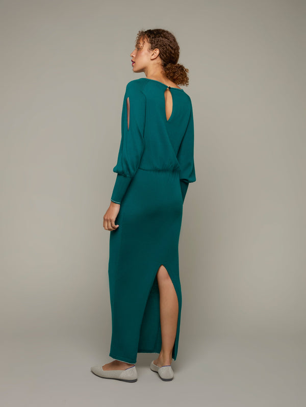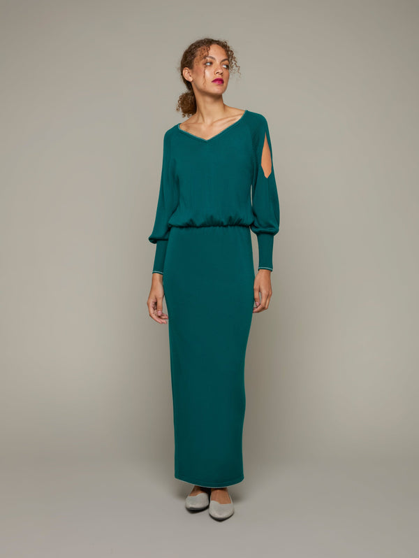 Gentle v-neck merino knit maxi dress with gathered waist, bell sleeves with slit and metallic trim at neck and hem & back slit.