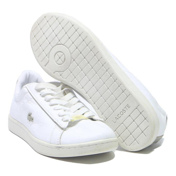 These LACOSTE Straightset trainers for women feature a clean, white leather upper with subtle off-white detailing on the sides and heel. The iconic crocodile logo is embossed in muted beige on the side for a classic branded touch. The lace-up design offers a secure fit, complemented by a padded collar for extra comfort.