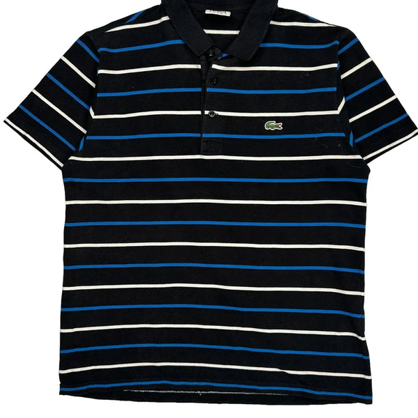 Black Polo Shirt With Blue And White Stripes, Lacoste Logo On Chest.