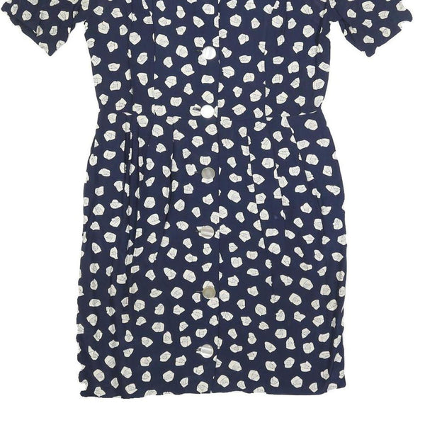 This womens dress by LAFAYETTE features a navy blue base with an all-over white floral pattern resembling abstract rose shapes. It has a button-down front with white buttons, short sleeves with a slightly ruffled edge, and a defined waistline creating a flattering silhouette. The dress falls to a short length, suitable for daytime wear.