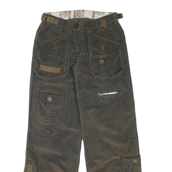These womens trousers by LALTROMODA EJANS feature a rugged olive green cotton blend fabric with multiple flap and zip pockets on the front and back, creating a utilitarian look. The trousers have a relaxed fit with a straight leg cut and a secure zip closure at the front waist. Decorative tabs with metal rings and button details add to the practical styling.