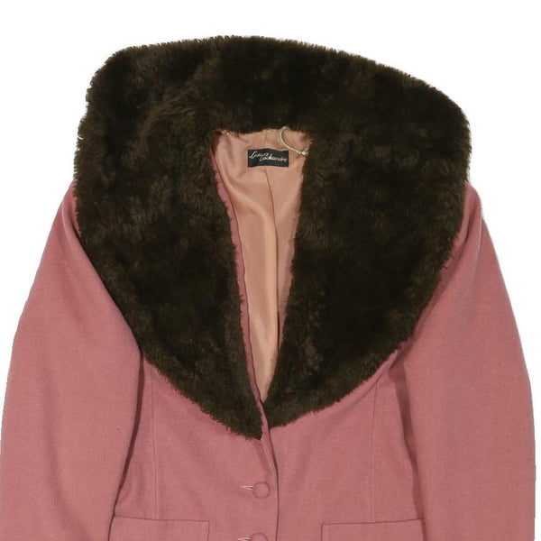 This Womens jacket by LANA CACHEMIRE presents a classy pink wool blend fabric with a soft, warm feel for comfortable wear. It features a striking, large dark brown faux fur collar that adds a luxurious touch and contrasts beautifully against the pink body. The jacket has a sleek, tailored silhouette with a length that falls below the hips.