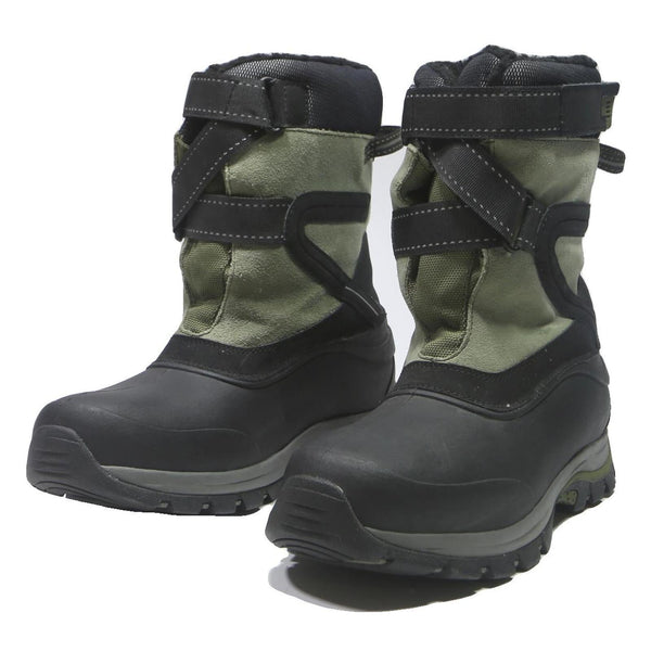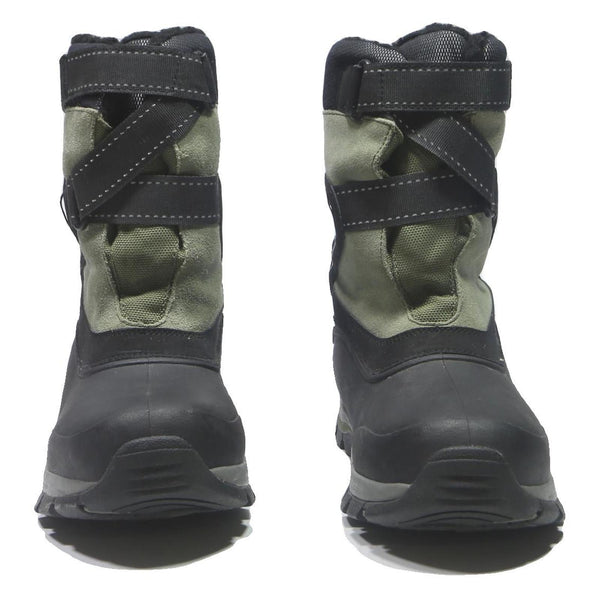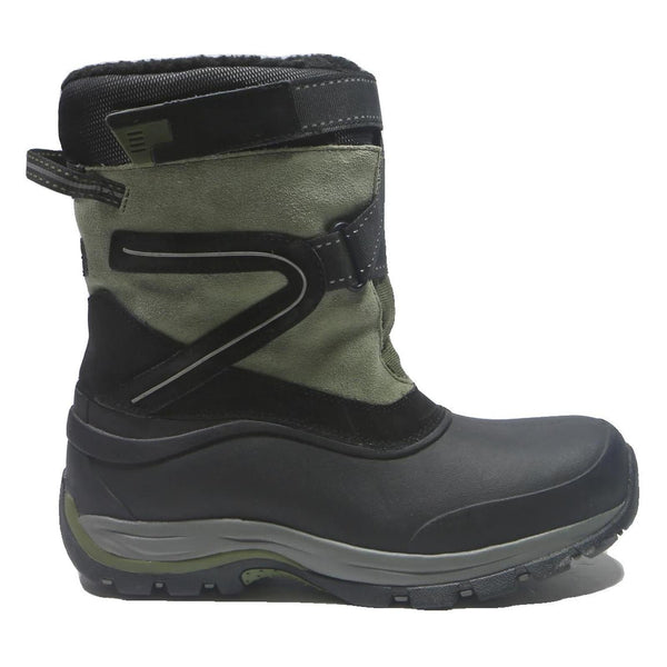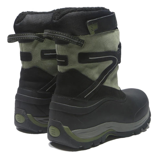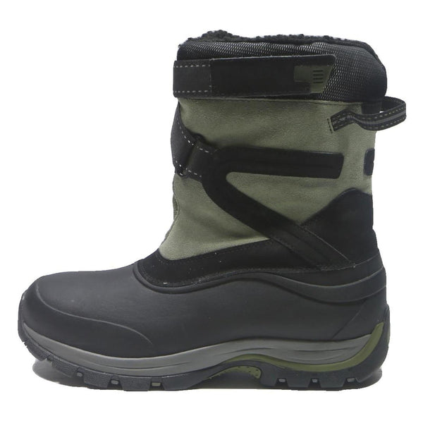 These Lands End men's winter boots feature a waterproof lower section in black paired with an olive green upper made from a soft polyester blend material. The boots have a rugged treaded sole suitable for winter conditions and an ankle height design for added warmth and protection.