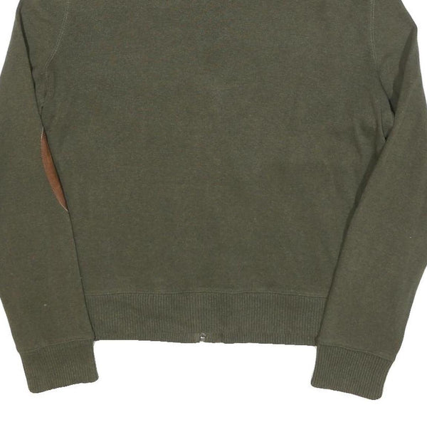 This womens jumper by Lauren Ralph Lauren is crafted from a cotton blend for a soft and comfortable feel. It features an olive green colour with distinctive brown suede elbow patches adding a classic, stylish touch to the design. The jumper has a sleek full zip closure and a ribbed crew neck, cuffs, and hem.