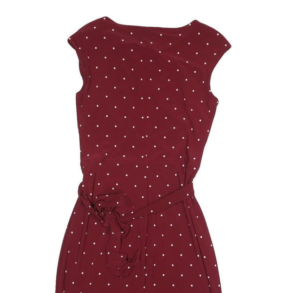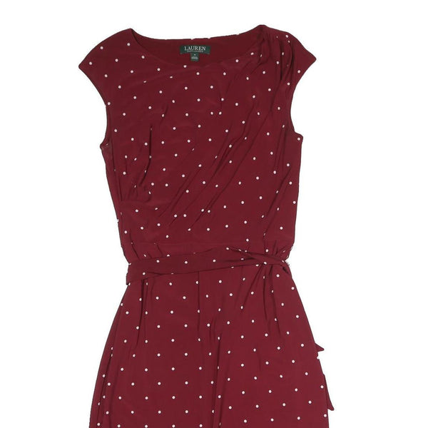 This Lauren Ralph Lauren womens dress features a rich maroon base adorned with a classic white polka dot pattern for a timeless look. The dress includes a matching fabric belt tied at the waist, creating a flattering silhouette. It has a subtle scoop neckline and cap sleeves for a feminine touch.