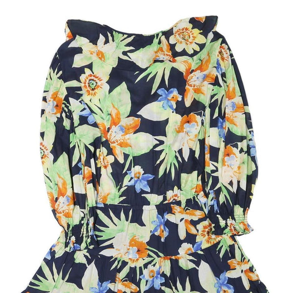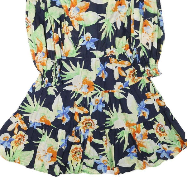 This Lauren Ralph Lauren dress features a vibrant navy blue base adorned with a colourful floral pattern in shades of green, orange, white, and blue. It has a flattering wrap style with a V-neckline and frill detail around the neck and hem, adding a feminine touch to the design.