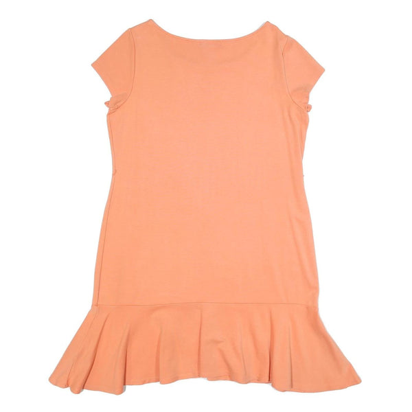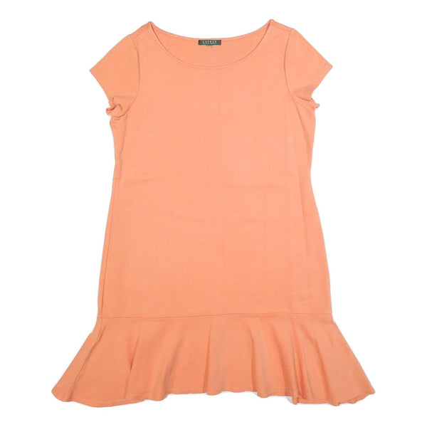This womens dress from Lauren Ralph Lauren features a delicate peach shade with no additional patterns, delivering a clean and classic look. The garment has a round neckline and short sleeves, complemented by a flared ruffle hemline that adds a feminine and playful touch to the design.