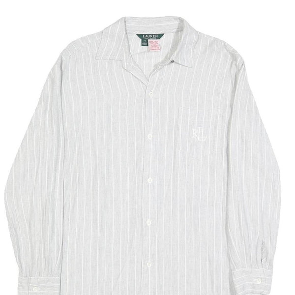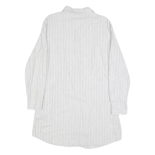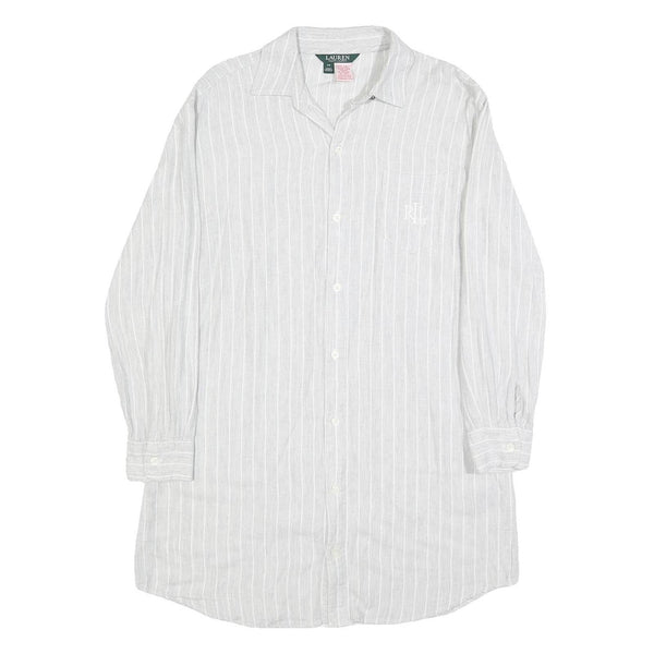 This Lauren Ralph Lauren womens dress features a classic white base with subtle vertical stripe detailing, creating a clean and timeless look. The front displays a discreet chest pocket embroidered with the RL logo, adding elegant branding to the relaxed design. It has a traditional shirt collar and a button-down closure extending through the front.