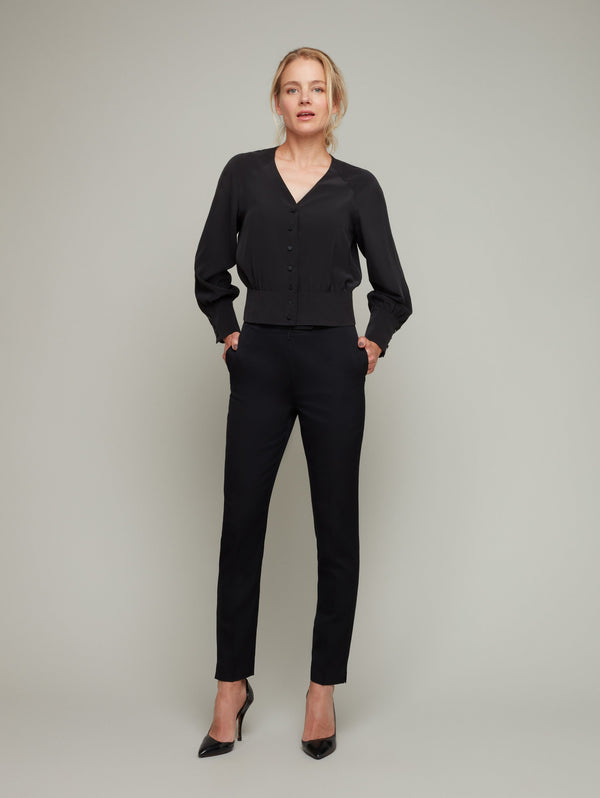 This soft, fluid silk blouse is deftly finished with raglan gathered sleeves at wide cuff and a bodice gathered at a low wide waistband.