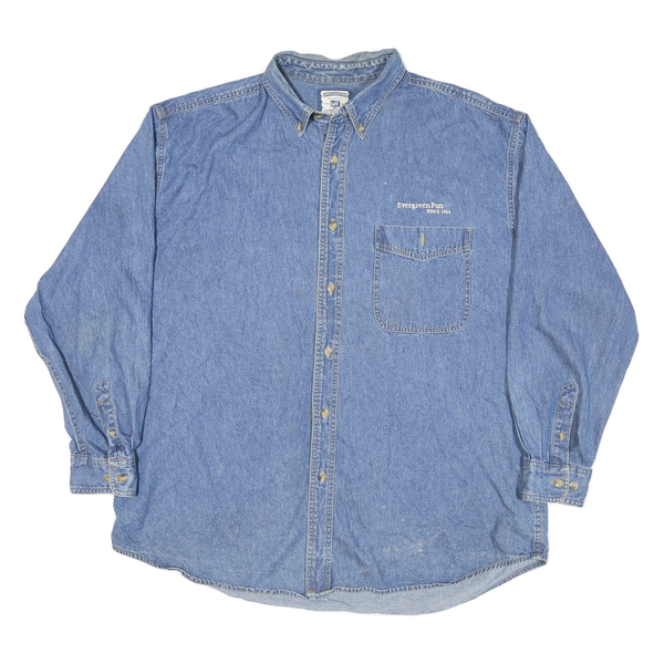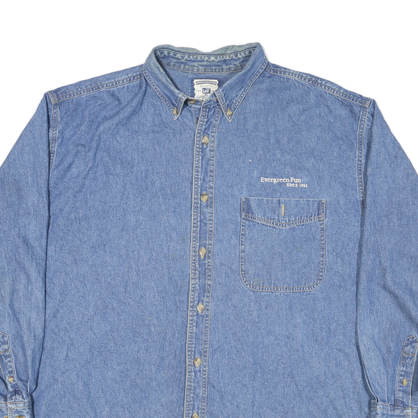 This classic LEE mens shirt is crafted from a comfortable cotton blend in a timeless denim blue shade. It features a button-down front and a neat button-down collar for a polished look. The shirt includes a single chest pocket on the left side with embroidered text reading "Evergreen Fun SINCE 1932," adding a subtle branded detail.