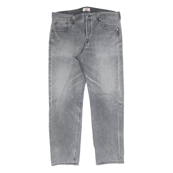 These LEVI'S 501 Mens Jeans feature a classic grey denim with a medium wash, presenting a vintage yet versatile appearance. They have the trademark five-pocket design, copper rivets, and a button closure. The iconic leather patch and branded red tab on the back pocket confirm the authenticity of this classic model.