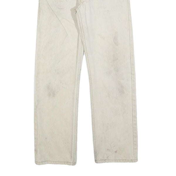 The fabric offers a comfortable regular fit suitable for everyday wear, with enough structure to maintain shape. The white denim shows light signs of wear and slight staining, adding character to the jeans while retaining their iconic Levi's style. These jeans are perfect for casual looks or layering with seasonal outfits.