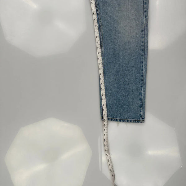Classic Light Wash Jeans With Slight Fraying At The Hem.