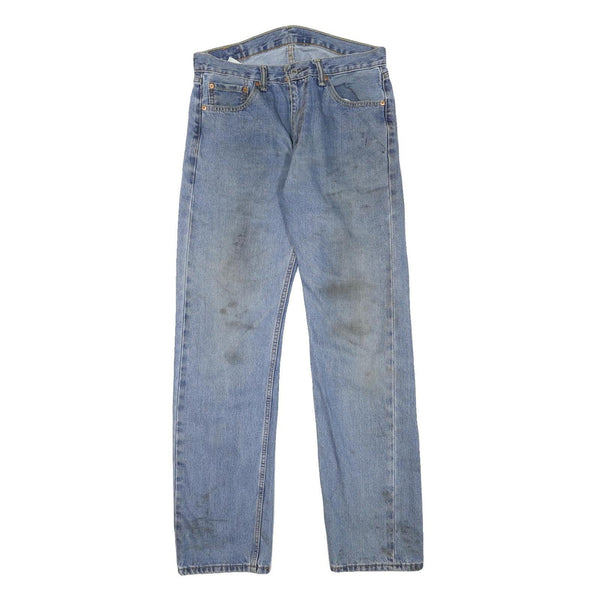 Made from a cotton blend denim, these jeans provide a sturdy yet comfortable feel. The closure is a practical zip fly, maintaining the timeless 505 model silhouette. Visible signs of wear and stains are present, consistent with fair pre-loved condition.