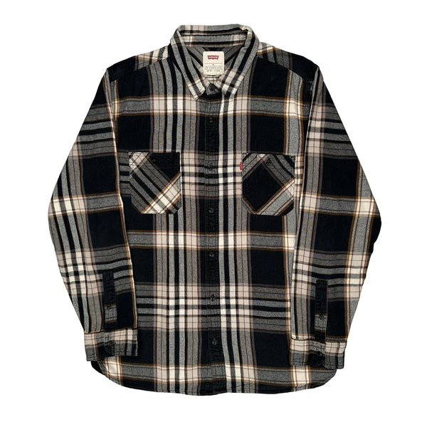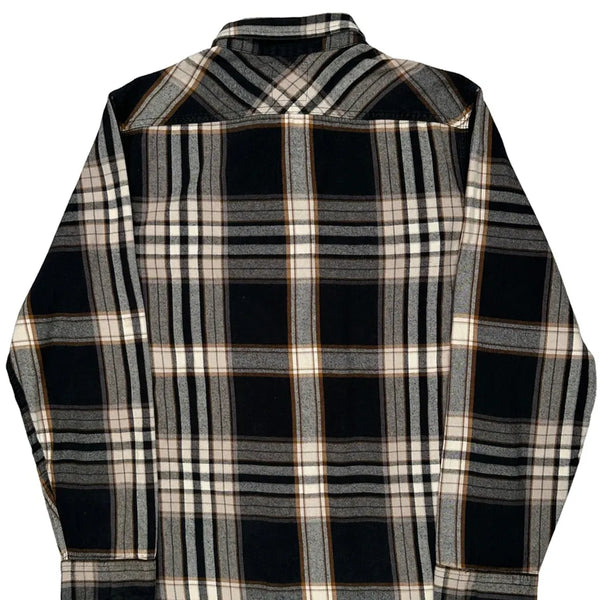 Black, Gray, And White Checked Flannel Shirt With Button-Down Front And Chest Pockets.