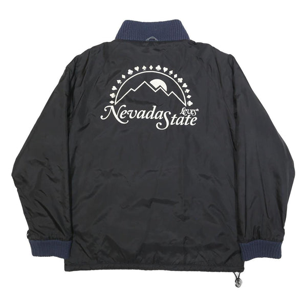 This LEVI'S mens jacket features a sleek black body contrasted by a navy ribbed collar and cuffs for a subtle, stylish colour combo. The front is plain with a full zip closure and two angled front pockets edged in light grey trim for convenience and a hint of contrast. On the back, it displays a bold white graphic reading 'Nevada State' with a mountain and moon design over a row of card suit symbols, adding a unique distinctive style.