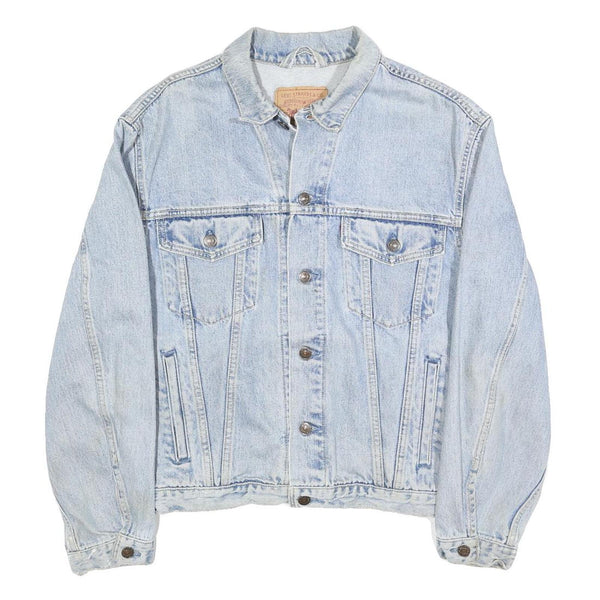 This Levi's mens jacket is made from a light blue denim fabric, showcasing a classic trucker-style design with button closures down the front. The jacket features two button-flap chest pockets and side welt pockets. The denim has a softly worn, vintage look with subtle fading throughout.