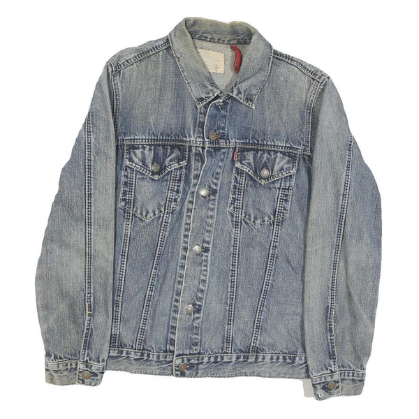 This Mens Levi's denim jacket showcases a classic blue wash with typical fading and wear marks consistent with pre-loved use. The front features two chest flap pockets with button closures and silver-tone metal buttons running down the centre front for fastening. The iconic red Levi's tab is subtly placed on the left chest pocket seam, adding authentic branded appeal.