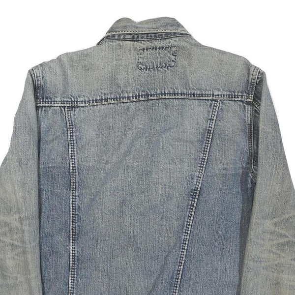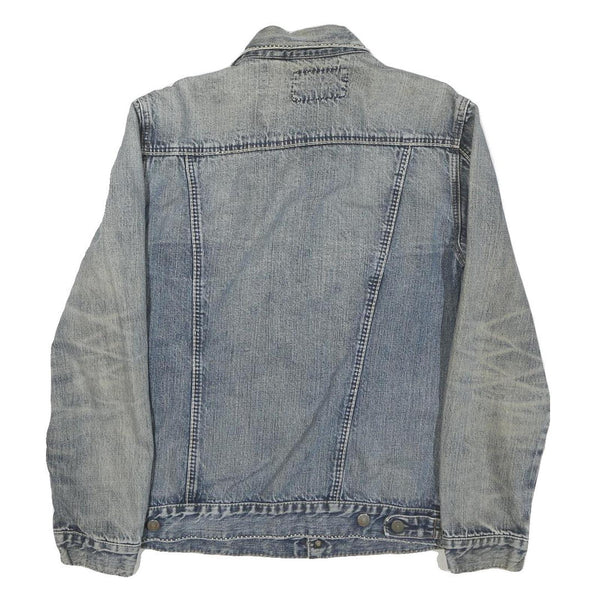 Crafted from a durable cotton blend denim fabric, the jacket provides a comfortable and stiff texture typical of vintage denim jackets. It has a regular fit with a straight cut, extending to the waist length, and long sleeves with buttoned cuffs. There is a repaired patch detail on the upper back, indicative of previous wear and mending. This timeless outerwear piece suits casual or streetwear styles.