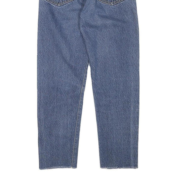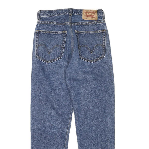 These classic LEVI'S mens jeans feature a rich blue denim with subtle medium wash highlights on the front knees for a slightly worn effect. The traditional five-pocket design includes copper rivet details and signature stitch pattern on the back pockets. A leather patch with the brand’s logo is stitched into the back waistband for authentic styling.