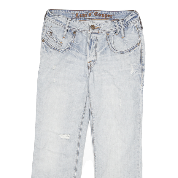 These Levi's mens jeans feature a light blue denim with a faded vintage wash and subtle distressing on the front thigh and knee areas. Classic five-pocket styling is enhanced by contrast stitching and the iconic Levi's red tab on the back pocket. The waistband shows "Levi's Copper" branding inside for a distinctive touch.