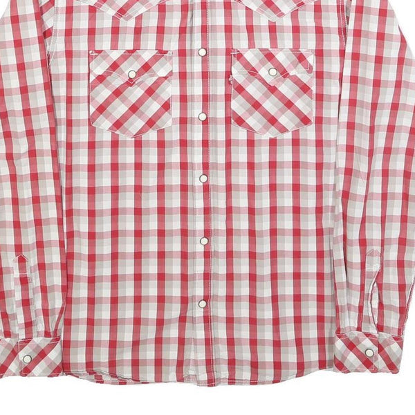 This Levi's mens shirt features a classic check pattern in red and beige with white accents, creating a timeless Western-inspired look. The shirt includes distinctive yoke detailing on both the front and back, along with two flap chest pockets secured with snaps for added style and functionality.