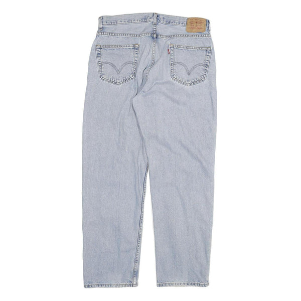 These mens Levi's jeans feature a classic regular fit in a light blue denim wash, crafted from a durable cotton blend fabric. The jeans showcase the iconic Levi's back pocket stitching and a leather patch on the waistband.