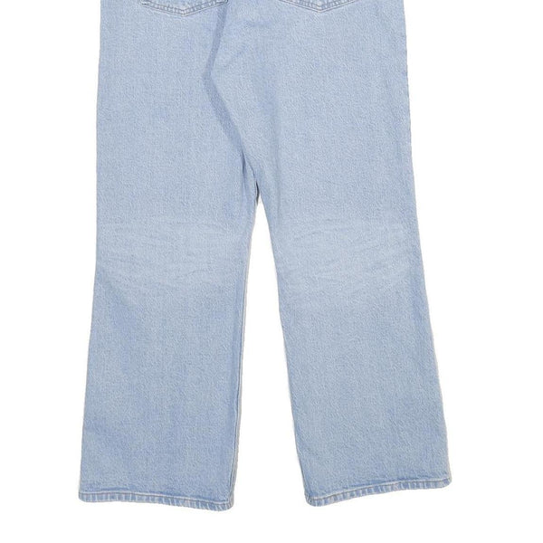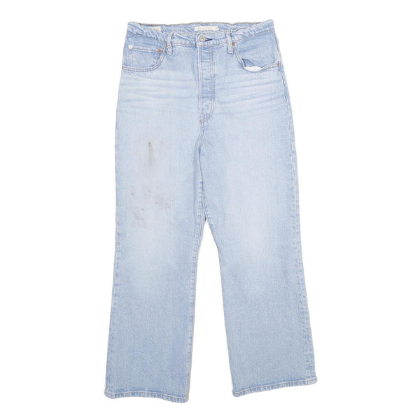 These Levi's Ribcage Crop Bootcut Big E jeans for womens feature a classic light blue denim appearance with subtle fading and vintage-style pocket stitching. The cotton blend material offers a sturdy yet comfortable feel, perfect for everyday wear. The jeans fasten with a button closure, typical of the Ribcage model.