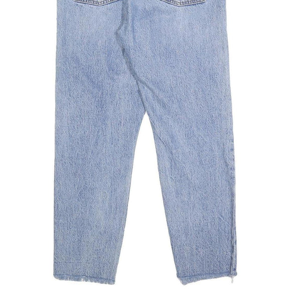 Made from durable cotton, the fabric offers a sturdy yet comfortable feel with a button closure at the waist. The ankle-length cut has raw hems adding a contemporary edge. These jeans encapsulate Levi's authentic 90s style with the 'Big E' label, a hallmark of vintage Levi’s craftsmanship.