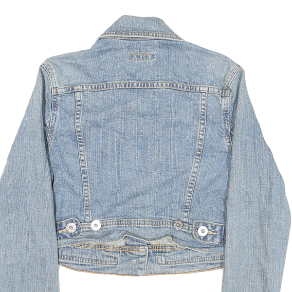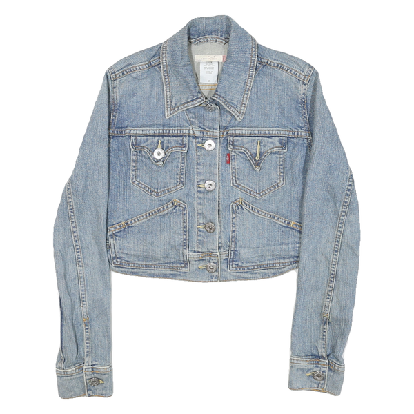 This LEVI'S womens jacket is crafted from a cotton blend denim fabric in a classic blue shade. It features a button closure at the front and a traditional collar, complemented by two top chest pockets with button flaps and two angled lower pockets. The jacket is cropped in length, offering a modern fit that enhances casual and streetwear styles.
