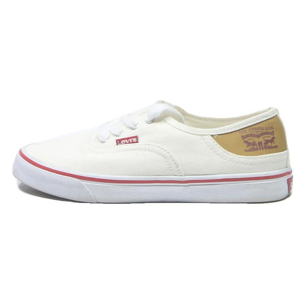 These Womens trainers from LEVI'S feature a clean white canvas upper with classic lace-up closure. There is a tan patch on the heel embossed with the LEVI STRAUSS & CO branding and a small red LEVI'S tag on the side panel. The trainers have a red and white striped trim on the rubber sole for a stylish finish.