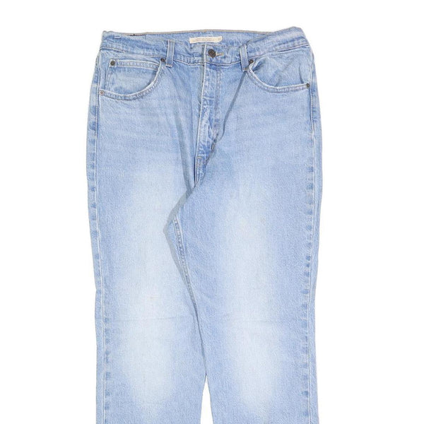 These LEVI'S womens jeans feature a light blue denim fabric with a classic straight leg cut. The jeans display traditional five-pocket styling and a zip closure, complemented by the iconic LEVI'S red tab on the back pocket and a leather branded patch on the waistband. The fabric shows subtle fading and wear consistent with pre-loved denim, adding vintage character.