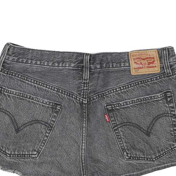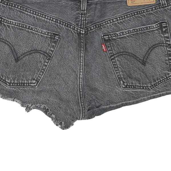 These womens Levi's shorts feature a deep black denim wash with subtle fading. The design includes classic five-pocket styling accented by copper rivets and detailed stitching on the back pockets. The hemline is left raw and frayed for a trendy cut-off effect that adds casual flair to the look.