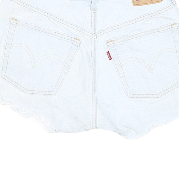 These LEVI'S womens shorts showcase a bright white wash denim with a classic five-pocket style and copper rivet details. The cut-off hem adds casual charm and a hint of vintage flair. Subtle fading and whiskering enhance the authentic denim look, complemented by the iconic LEVI'S red tab and logo patch at the waistband.