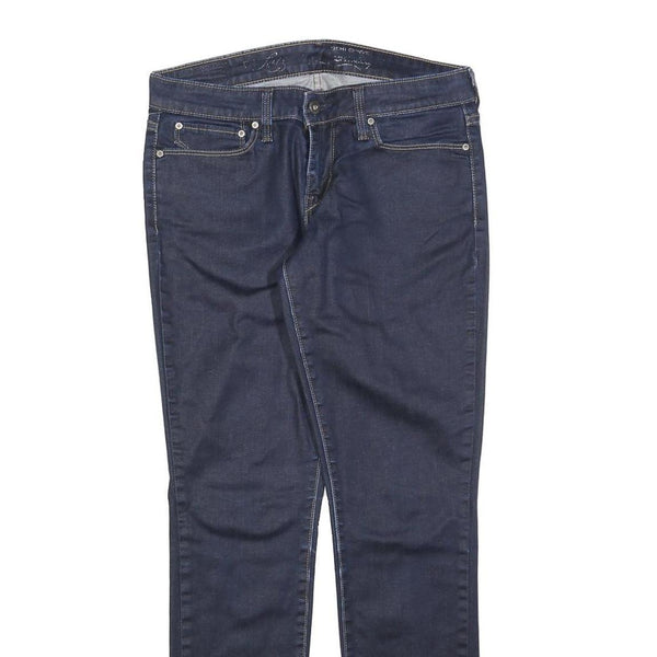 These Levi's womens jeans feature a classic slim fit with a sleek dark blue denim fabric, crafted from a comfortable cotton blend offering both durability and stretch. The jeans have a zip closure and traditional Levi's branding.
