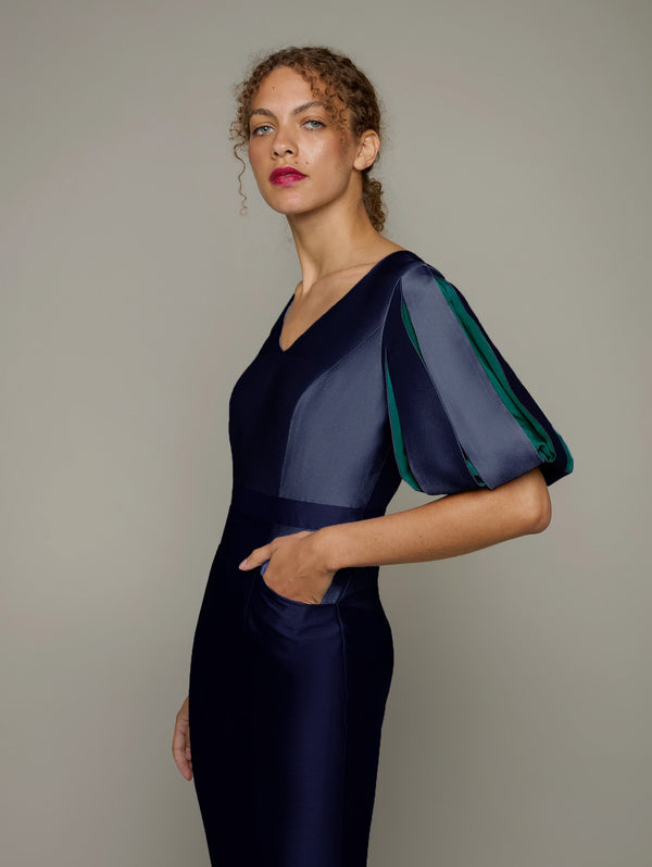 Made to party, this stunning pencil cocktail dress with a gentle v-neck has been crafted from the softest Italian silk-blend pique. The high waisted dress has statement puff sleeves with contrast slits, inspired by the Elizabethan era, voluminous & three-dimensional, they both conceal & reveal. Available also in Shadow Blue & Mahogany Rose.