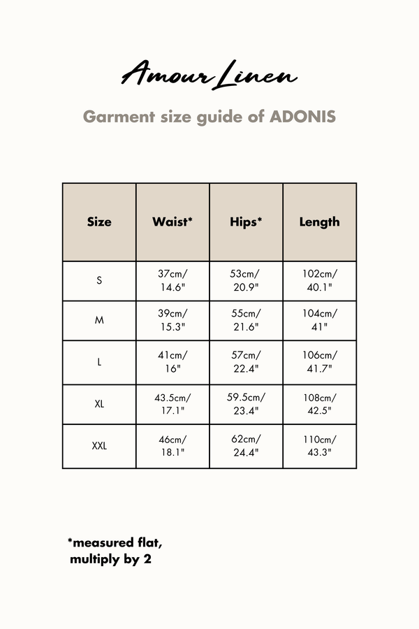 Wash your linen in cold or warm water on a gentle cycle (30-40 degrees Celsius). Best to dry naturally in a shady spot. We recommend not using a dryer; you may iron if needed (although we prefer our linen wrinkled!). Do not dry clean as it weakens the fiber.