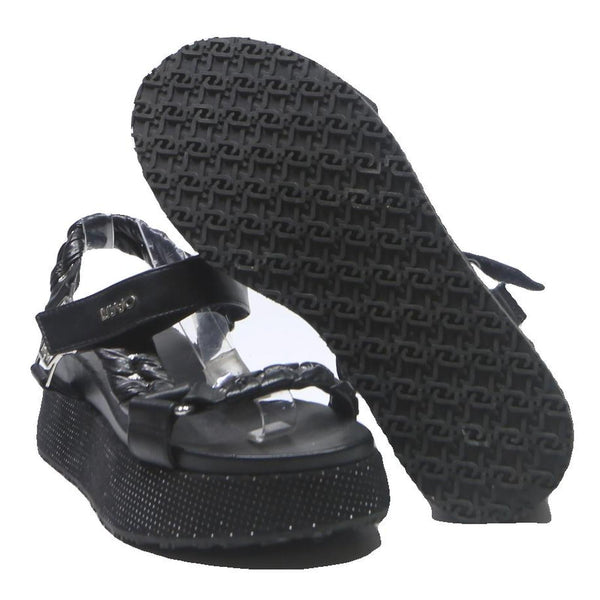 These womens sandals by LIU.JO feature a sleek black leather upper with braided detailing and a padded ankle strap for adjustable comfort. The sandals have a platform sole embellished with small reflective studs for a modern, edgy look. The metallic hardware accents add a touch of luxury to the design.