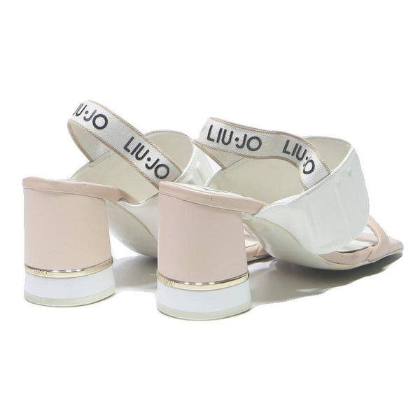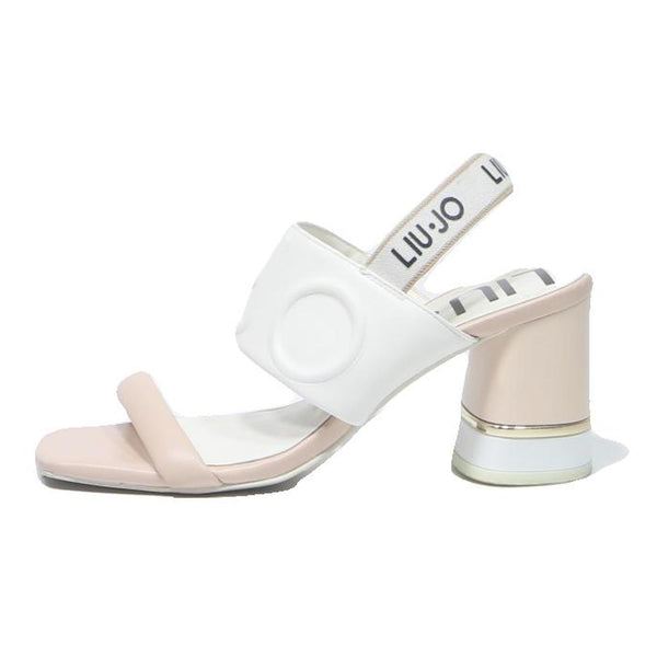These Liu Jo womens block heel sandals feature a stylish combination of beige and white leather, offering a modern and elegant look. The beige toe strap and heel contrast with the wide white mid-foot strap embossed with the LIU JO logo, along with a branded elastic slingback strap for a secure fit.