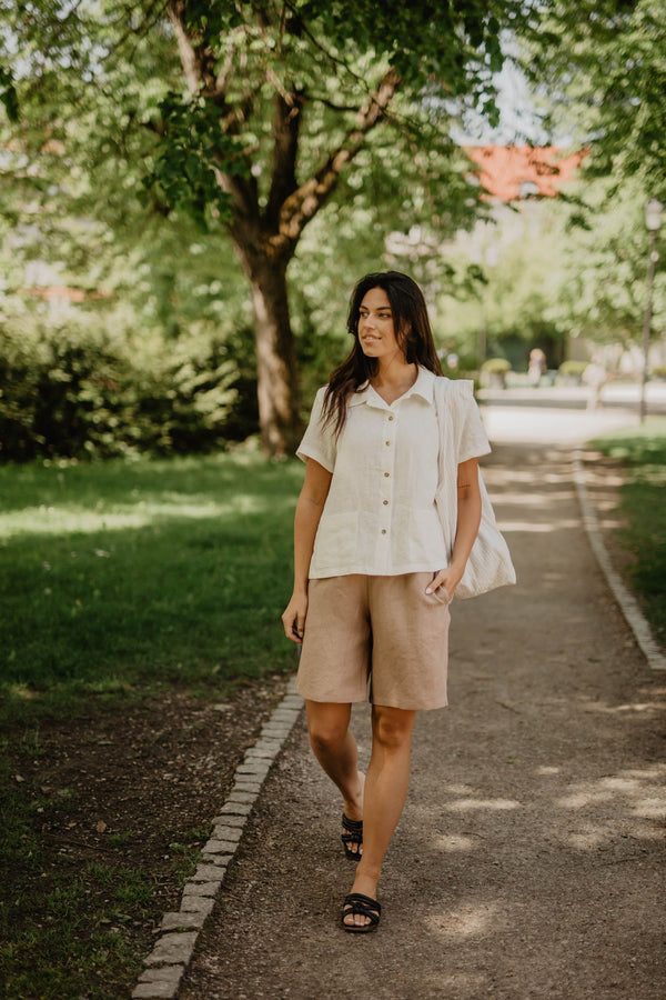 Mid-length linen skirt BERGEN. With an elastic waist band, pockets and a linen belt. Perfect for every occasion and every season, you can wear it during a hot summer or in winter with tights.