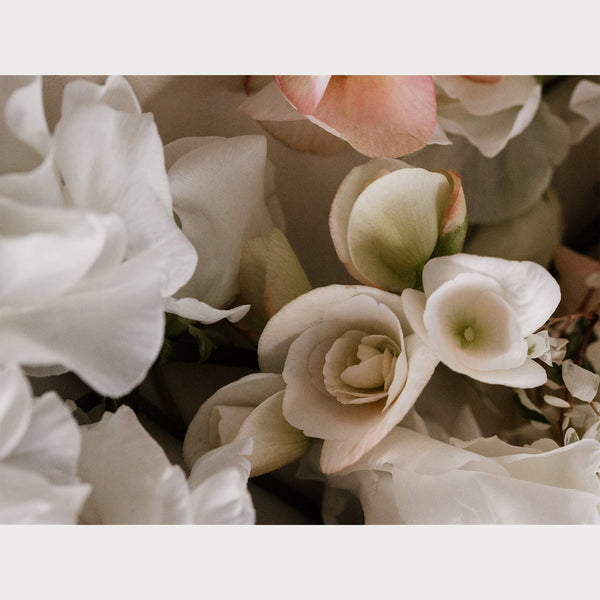 Inspired by Spring blooms such as ranunculus, cosmo, poppy, begonia, pieris, stock and tulips, layered in soft romantic textures. Love Letter is the combination of white and cream Spring florals with hints of soft and peachy pinks. Learn more about Alice de Crom here.