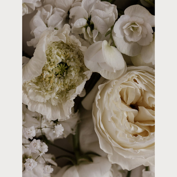 Inspired by Spring blooms such as ranunculus, cosmo, poppy, begonia, pieris, stock and tulips, layered in soft romantic textures. Love Letter is the combination of white and cream Spring florals with hints of soft and peachy pinks. Learn more about Alice de Crom here.