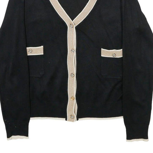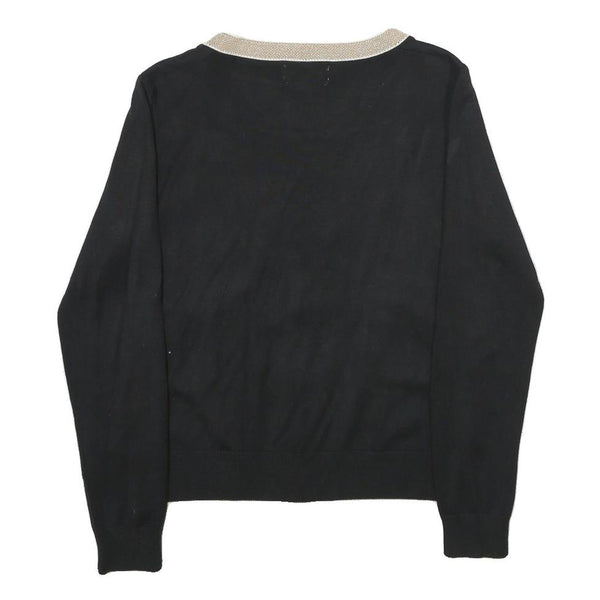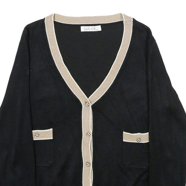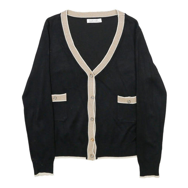 This LUC-CE womens jumper is crafted in a classic black with beige trim detailing along the V-neckline, button placket, and pocket edges. The subtle contrast trim adds a refined touch to the plain design, offering timeless style and versatility.