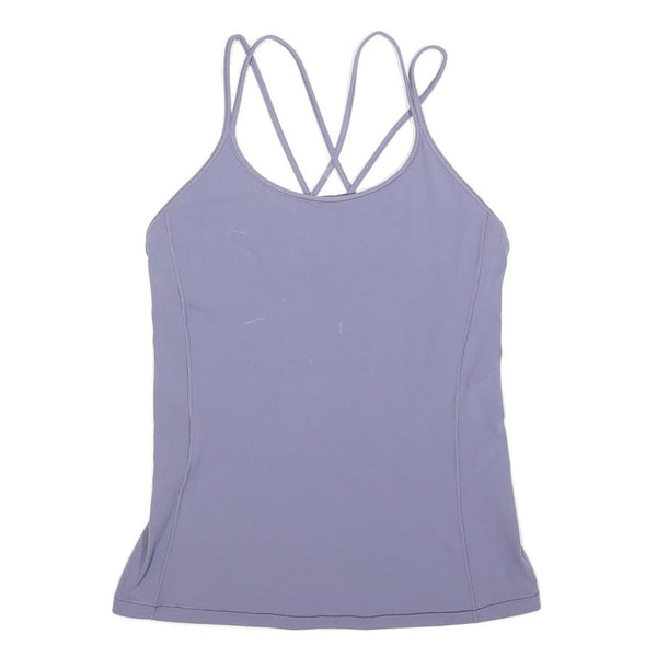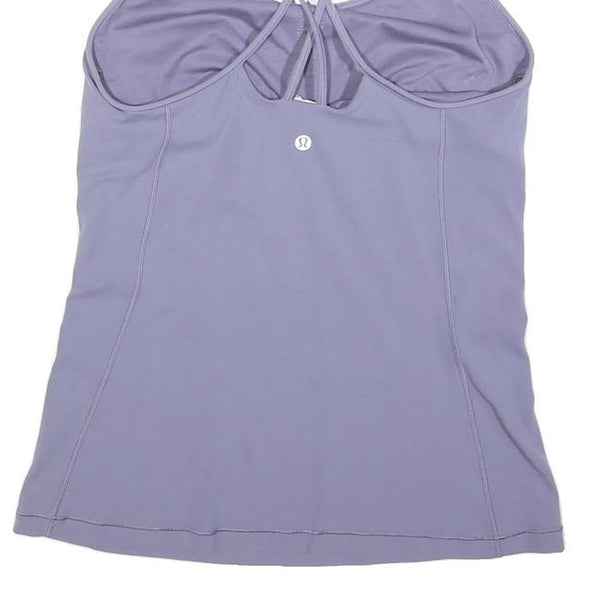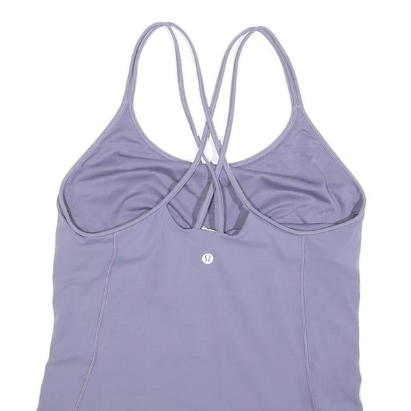 This Lululemon womens top features a soft purple colour with a sleek, minimalist design. It has a scoop neckline and thin crisscross straps at the back, adding a delicate, stylish detail. The fabric is smooth and stretchy, enhancing comfort and mobility.