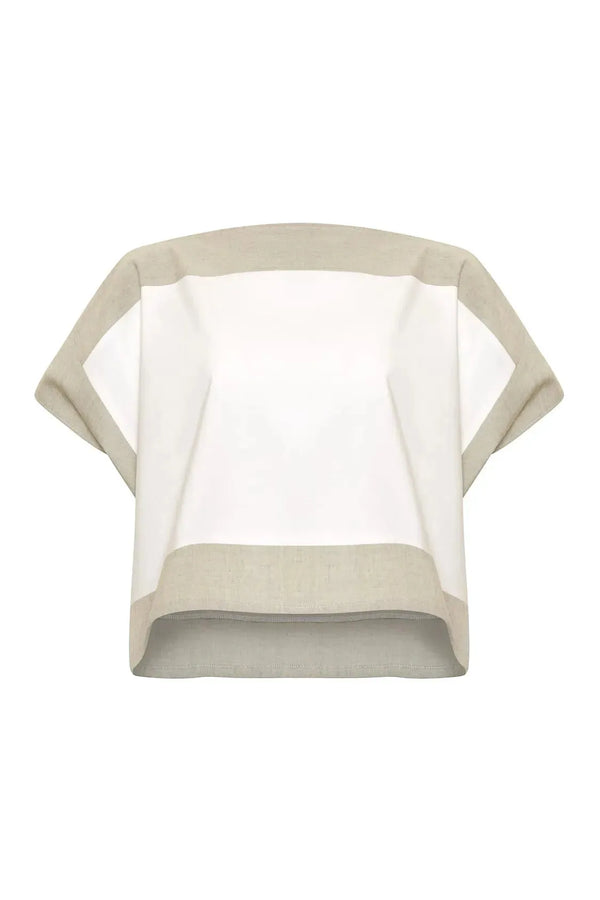 The high neck and clean, straight lines give this top a lovely, slender shape through the shoulders and sleeves, while its wide hemline creates a striking profile. The top is edged with a broad, contrasting trim that flows through the shoulders, sleeves and hemline and accentuates its beautiful, modern shape.